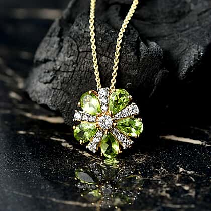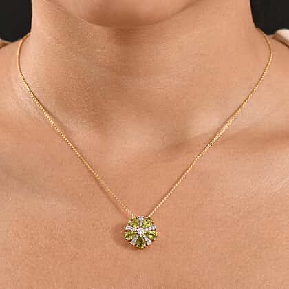 D'joy Natural Hebei Peridot, White Zircon Blossom Pendant with Torn Chain 19DC (Size 20) in Yellow Gold Plated Sterling Silver 2.83 Ct.