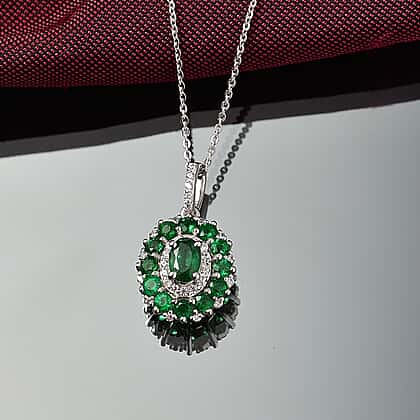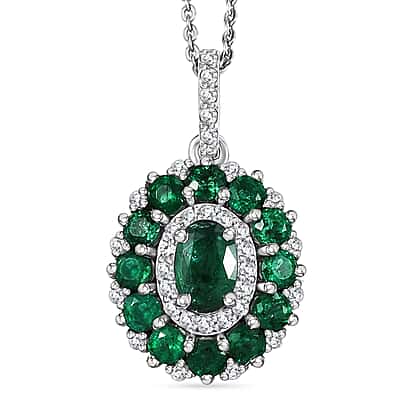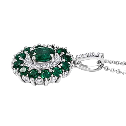 D'joy Zambian Emerald & White Zircon Pendant with Chain (Size 20) in Rhodium Overlay Sterling Silver 1.57 Ct.