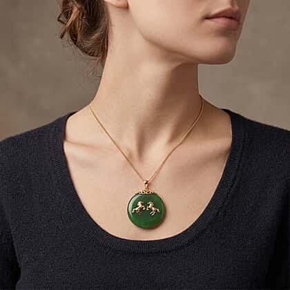 Embrace symbolic design with this jade horse pendant, combining bold colour with detailed craftsmanship. The round dyed green jade forms a smooth and polished base, offering depth and a rich visual presence. Set on the surface, the horse motif is rendered in yellow gold plating on 925 sterling silver, adding contrast and intricate detailing. The pendant is paired with an 18-inch chain, allowing it to sit neatly along the neckline. The polished finish enhances the clarity of both the jade and the motif, while the structured design ensures a balanced look suitable for both occasion and everyday wear.