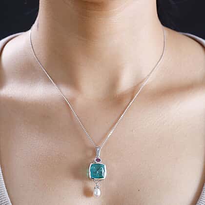 This fascinating Emeraldine Quartz, Freshwater Pearl and Lotus Garnet Pendant has a retro look that laces it with a rare aristocracy. The pendant hangs from a Matinee length chain in Size 20, diligently crafted from Rhodium Overlay Sterling Silver the pearl drops add to the elegance of the posh design.