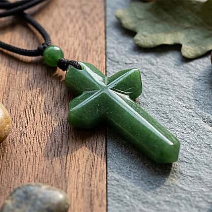 Enhanced Green Jade Carved Cross Adjustable Necklace (Size - 28) 35.00 Ct.