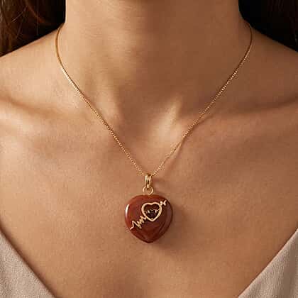 Warm colour and romantic symbolism come through in this enhanced red jade, red garnet heart pendant with chain. The heart-shaped pendant features a heart-shaped garnet, exuding deep red sparkles. Red jade is admired for its passionate tone and emotional significance, while red garnet adds fiery brilliance, valued for its rich colour and robust nature. The heart design speaks to affection and intention, framed in warm gold plating. Sterling silver beneath remains hypoallergenic, tarnish‑resistant and won’t turn green. Add this pendant when you want expressive colour paired with a heartfelt shape that stands out beautifully.