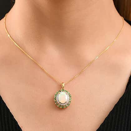 Ethiopian Faceted Opal, Zambian Emerald & White Zircon Pendant with Chain (Size 20) in 18K Vermeil Yellow Gold Plated Sterling Silver 3.17 Ct.