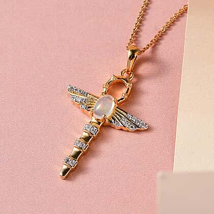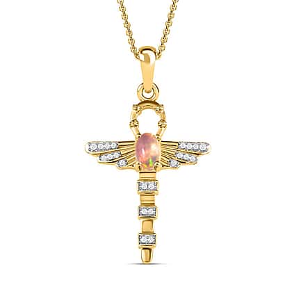 Ethiopian Opal and White Zircon Ankh Pendant with Chain (Size 20 Inch) in 18K Vermeil Yellow Gold Sterling Silver