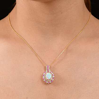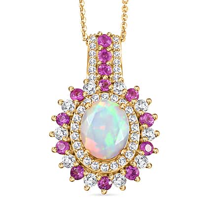 Ethiopian Opal, White Zircon & Pink Sapphire Cherry Blossom Pendant with Chain (Size 20) in 18K Vermeil Yellow Gold Plating Sterling Silver 3.54 Ct, Silver Wt. 5.87 Gms.