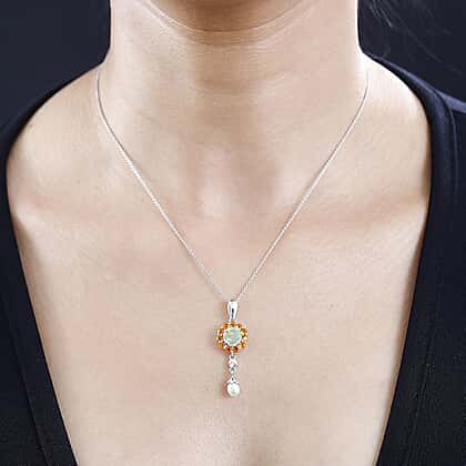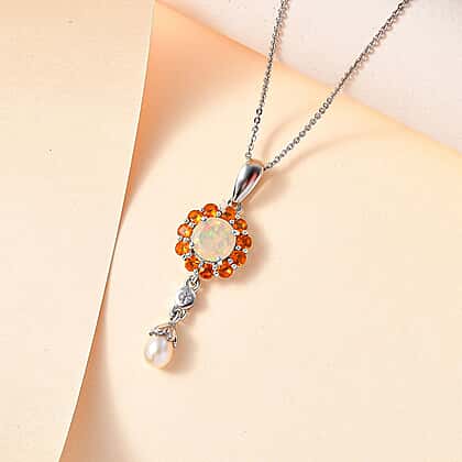 Adorn your neckline with this stunning Ethiopian opal pendant, as this beauty is designed just for you. This 20-inch necklace features a captivating opal surrounded by vibrant fire opals, adorned with dazzling white zircons, and finished with a graceful freshwater pearl drop. Set in sterling silver with platinum plating, this pendant is a timeless addition to any jewellery collection.
