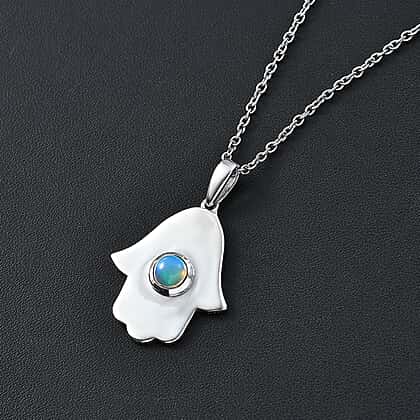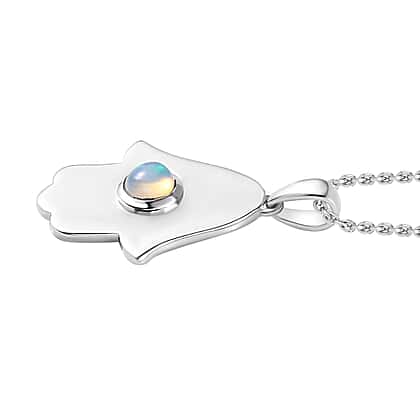 Ethiopian Welo Opal Hamsa Pendant with Chain (Size 20) in Rhodium Overlay Sterling Silver
