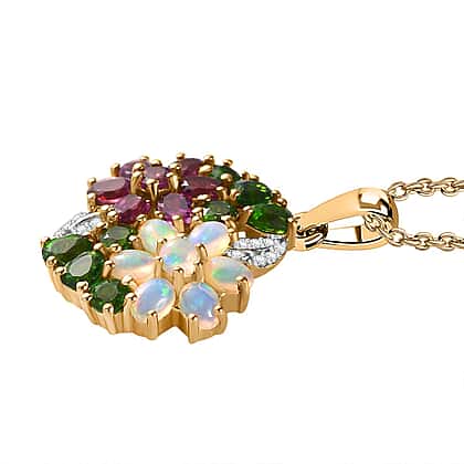 Ethiopian Welo Opal, Rhodolite Garnet, Chrome Diopside & Zircon Floral Pendant with Chain (Size 20) in 18K Yellow Gold Vermeil Plated Sterling Silver 3.5 Ct, Silver Wt 6.42 GM