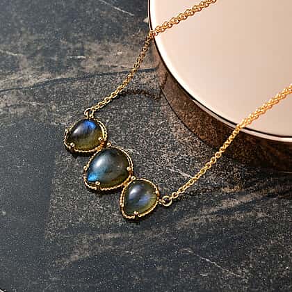 Illuminate your fashion game with this trilogy necklace, featuring captivating pear-shaped labradorite gemstones in deep blue and green hues. Labradorite lies at the centre of the necklace, flanked by two small labradorite gemstones, creating a trilogy design, symbolising past, present, and future. Meticulously crafted in pure yellow brass mix metal, this pendant guarantees durability and lasting shine. Features a sleek gold-tone chain with a secure lobster clasp closure, this piece ensures comfort and security. The yellow tone adds a luxurious touch, making it a versatile addition to your jewellery collection. Give yourself this refined beauty that adds charm to any outfit.