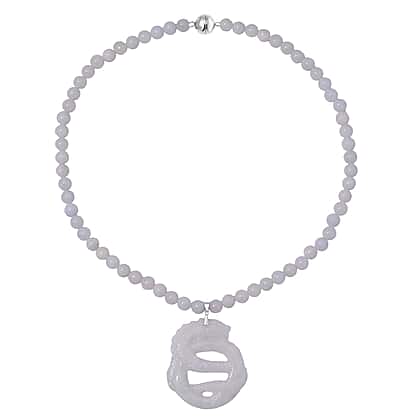 Embrace the timeless beauty of this natural hand carved jadeite jade dragon necklace. This stunning piece features intricately carved jadeite jade with a captivating dragon design, symbolising strength and power. The smooth jadeite jade beads, each meticulously polished, add an elegant touch to the necklace. With a length of 20 inches, it is the perfect accessory to complement any outfit. The beads are connected through a durable thread, ensuring longevity and resilience. The platinum overlay on sterling silver enhances the overall appeal, and the magnetic clasp offers easy and secure wear.