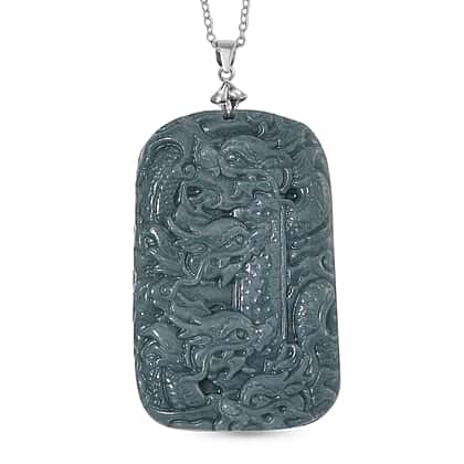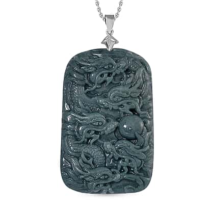 This stunning pendant showcases the unique artistry of Guatemala Type A Olmec Jadeite, carved with intricate details into a rectangular design. The beautifully hand-carved motif elaborates on swirling dragons, symbolising power, strength, and good fortune. Crafted from 224.00 Ct of natural jadeite, the gemstone boasts a deep green hue with a smooth, polished finish, reflecting its exceptional quality and rarity. Suspended from a rhodium-plated sterling silver chain with a secure lobster clasp, this pendant blends traditional symbolism with modern elegance, making it an unforgettable statement piece.