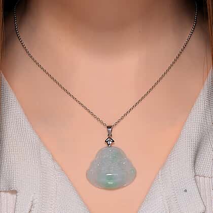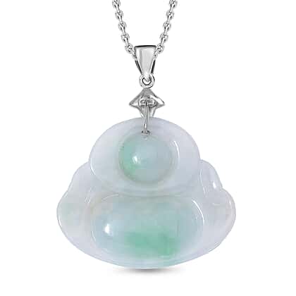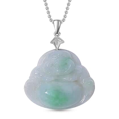 Jade Laughing Buddha Pendant with Chain (Size 20) in Rhodium Overlay Sterling Silver 20.00 Ct.