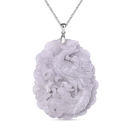 This Extremely Rare Find, a Carved Jade Pendant, is designed in Rhodium Overlay Sterling Silver. The big-sized jade features an intricate design featuring among other things a mythical bird with the majestic outline resembling that of a peacock. The scattering of foliage around the central figure lends depth to the design. The impeccable artistry combined with silver’s elegance lends a sophisticated look.