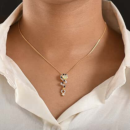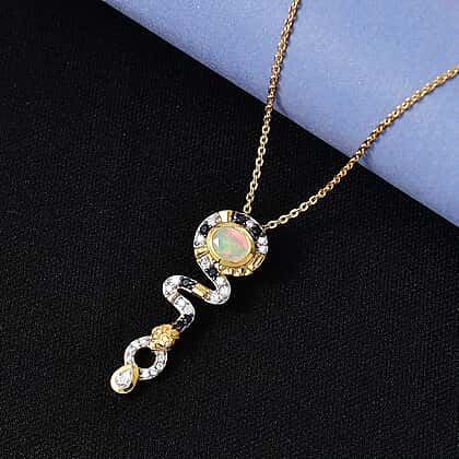 Faceted Ethiopian Opal, Moissanite & Black Spinel Pendant with Chain (Size 20) in Yellow Gold Plated Sterling Silver.