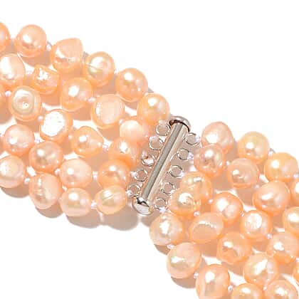 Ignite your inner allure by putting this freshwater peach pearl necklace on your neckline. This gorgeous 18-inch necklace features freshwater pearls in a lovely peach colour. The pearls are set out in multiple strands connected by a single enclosure. The lustre of the pearl gives a deep glow to the necklace. Rhodium plating protects the sterling silver base from tarnishes and scratches. The cylinder clasp provides a sturdy and secure fastening. A timeless classic, add it to your jewellery collection to add a vintage charm to your evening look.