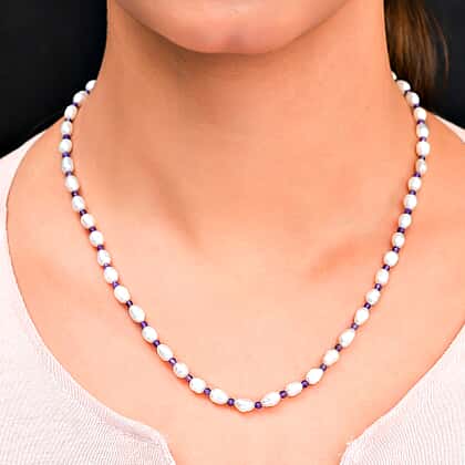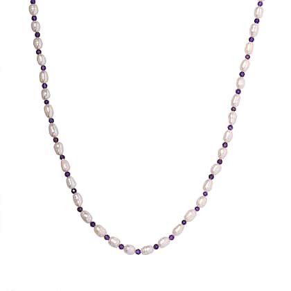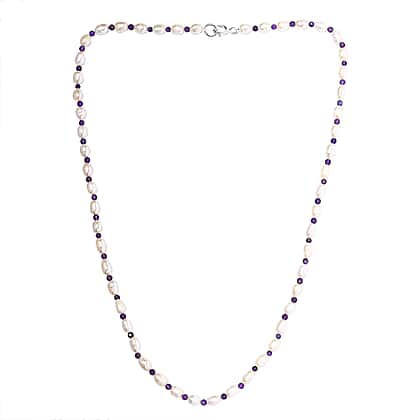 Freshwater Pearl, Amethyst Beads Necklace (Size - 18) with Spring Ring Clasp in Sterling Silver
