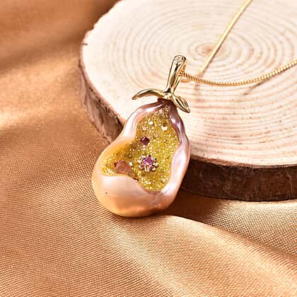 • The outer freshwater pearl holds golden druzy quartz, Mozambique garnet, zircons, and other gemstones beautifully inside of it, held with the help of strong settings