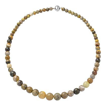 This 20-inch graduation necklace is crafted with 5-13 mm Indonesian bumble bee jasper beads. These jasper beads are a very rare find and have an exceptional AAA quality. The bead necklace lends a breezy makeover to your looks with its boho and earthy vibes. A 10mm silver magnetic lock in rhodium-plated silver makes the bead necklace easy to wear.