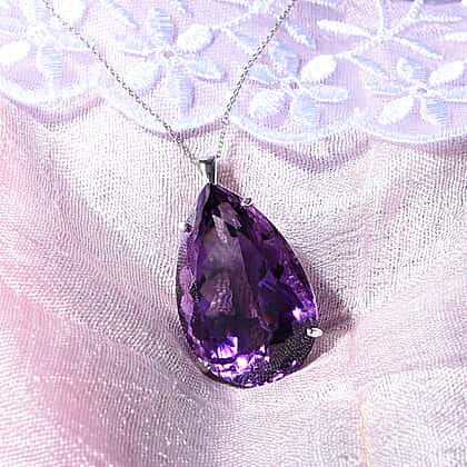 Celebrate significant milestones with this extraordinary solitaire pendant, showcasing a 100-carat African Amethyst pear, mesmerising in its size and beauty. The free faceted cut enhances its deep, rich hues, making it a captivating focal point of any look. Set in sterling silver with a platinum overlay for added durability and style, this 24-inch pendant is designed for those who seek standout pieces that combine opulent style with practical wearability.