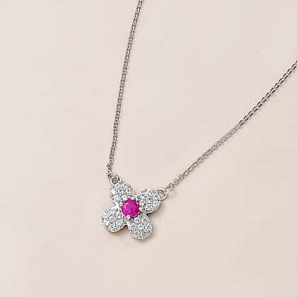 The captivating bloom in a spring-time garden is immortalised in this Mozambique Ruby and White Zircon Floral Necklace. The necklace with four petals has a ruby centrepiece mounted on prongs. The floral motif hangs from a Matinee length chain of Size - 20 that gets a spectacular display in Rhodium Overlay Sterling Silver.