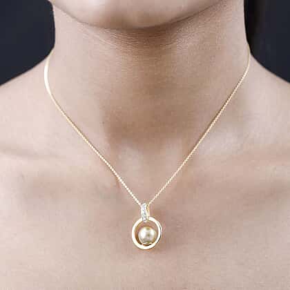 Golden South Sea Pearl, White Zircon Pendant with Chain (Size 20) in 18K Vermeil Yellow Gold Sterling Silver 0.18 ct Silver Wt. 5.37 Gms 0.190 Ct.