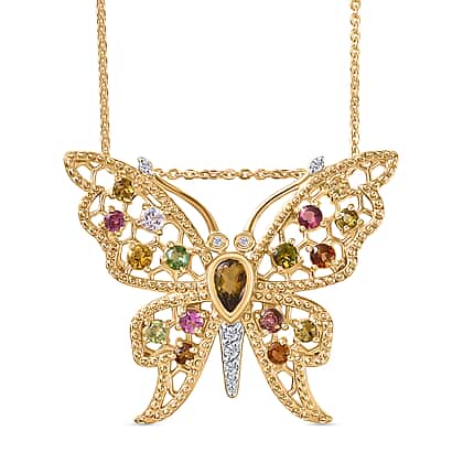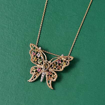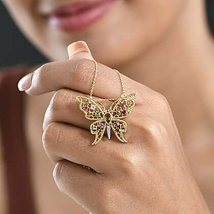 This vibrant butterfly-shaped pendant from the GP collection features a beautiful mix of multi-coloured tourmaline, Kanchanaburi blue sapphire, and zircon. Set in 18K vermeil yellow gold-plated over 925 sterling silver, the pendant showcases a delicate design that evokes the beauty of nature. The intricate detailing and sparkling stones capture light with every movement, adding a colourful pop to any outfit. With a matching chain included, this pendant is perfect for adding a luxurious and whimsical touch to both casual and formal looks.