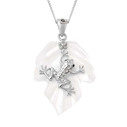 GP - White Mother of Pearl, Blue Sapphire and Boi Ploi Black Spinel Frog on Leaf Pendant With Chain (Size 18) in Rhodium Overlay Sterling Silver