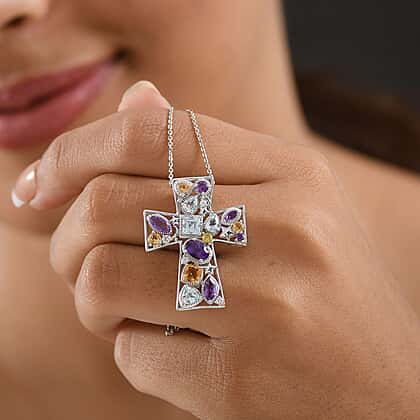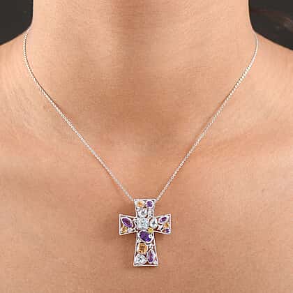 GP- Celestial Dream Collection African Amethyst, Skyblue Topaz, Citrine, White Zircon & Blue Sapphire Cross Pendant with Chain (Size 20) in Rhodium Overlay Sterling Silver 3.05 Ct.