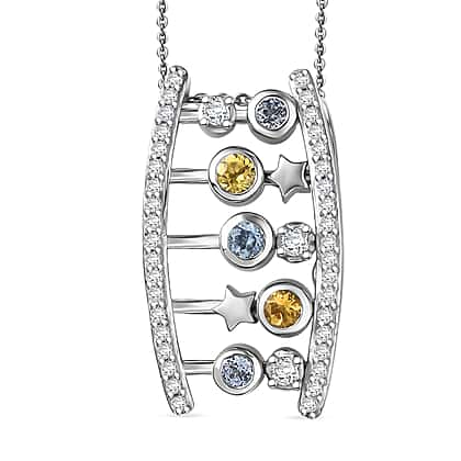 GP- Celestial Dream Collection Skyblue Topaz Citrine, White Zircon & Blue Sapphire Pendant with Chain (Size 20) in Rhodium Overlay Sterling Silver 1.14 Ct, Silver Wt. 7.77 Gms.