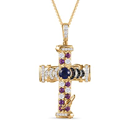GP Celestial Collection - Masoala Sapphire & Multi Gemstone Cross Pendant with Chain (Size 20) in Platinum Overlay Sterling Silver