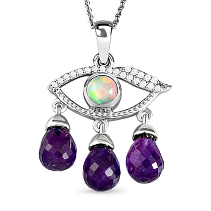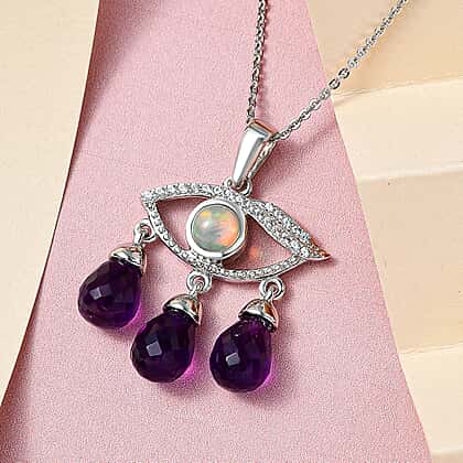 GP Evil Eye Collection - Amethyst, Ethiopian Welo Opal and Natural Cambodian Zircon Pendat with Chain (Size 20) in Platinum Overlay Sterling Silver 7.010 Ct, Silver Wt 5.01 Gms