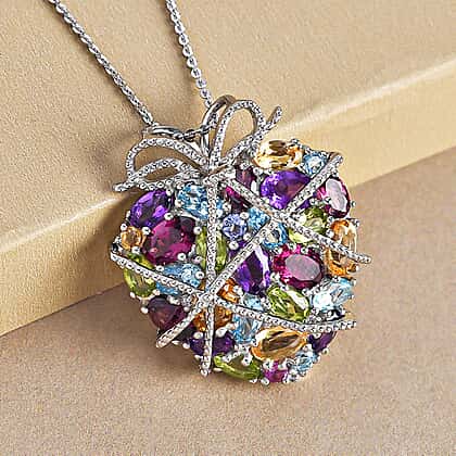 GP Heart Collection - Amethyst and Multi Gemstones Pendant with Chain (Size 18 With 2 Inch Extender) in Platinum Sterling Silver 8.06 Ct, Silver Wt. 9.51 Gms