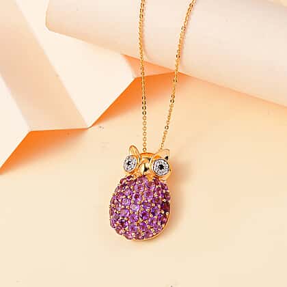 GP Collection - African Amethyst, White Zircon, Black Spinel Owl Pendant with Chain (Size 20) in 18K Yellow Gold Vermeil Plated Sterling Silver