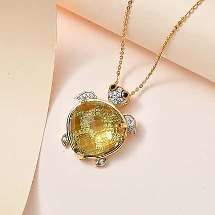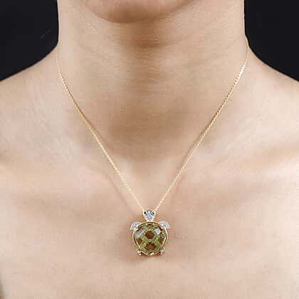 This enchanting pendant features a stunning Green Gold Quartz centrepiece, cut in a rose style to maximise its reflective qualities. Measuring 17x17mm, the quartz is set in a tortoise-shaped pendant, a symbol of wisdom and peace. The 20-inch chain finished in an 18K yellow gold vermeil complements the green hues of the quartz beautifully, enhancing the overall eye-catching design. Green Gold Quartz is not traditionally admired for its unique green-gold colour and lustrous finish that captures the essence of nature's palette.