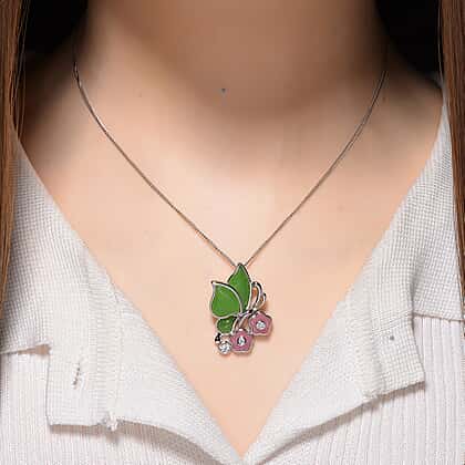 GP Italian Garden Collection - Green Jade, Pink Jade, White Zircon Butterfly Pendant with Chain (Size 18) in Rhodium Overlay Sterling Silver 7.54 Ct.