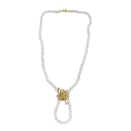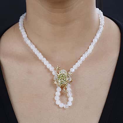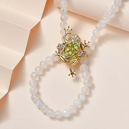 Discover the enchanting allure of the Hebei Peridot & multi-gemstone necklace – brooch by GP Italian Garden Collection. Displaying a unique frog design brooch, majestically embellished with vibrant Hebei peridot, this exquisite piece doubles as an enchanting necklace. The 24-inch necklace features a strand of luminous rainbow moonstone beads, each meticulously connected by a sturdy thread, ensuring elegance and durability. The piece is elegantly secured with a lobster clasp, while the frog brooch sparkles in 18K vermeil yellow gold plated sterling silver, adding a touch of whimsy and luxury to your ensemble.