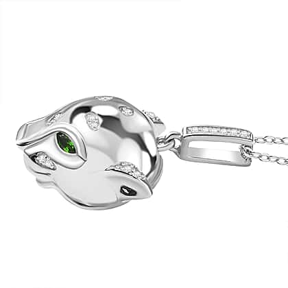 GP Tiger Totem Collection - Moissanite & Chrome Diopside Puma Pendant with Chain (Size 20) in Rhodium Overlay Sterling Silver