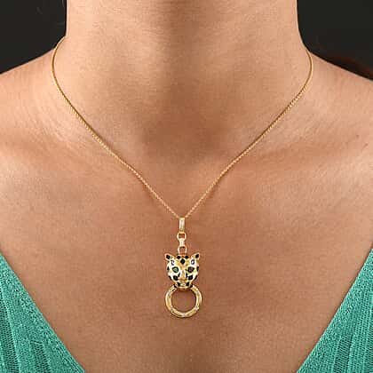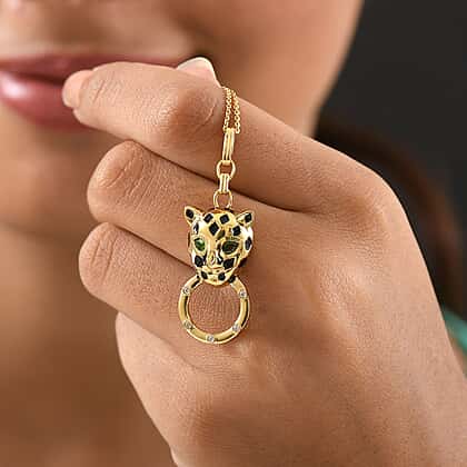 GP Tiger Totem Collection Natural Chrome Diopside, White Zircon & Blue Sapphire Panther Pendant with Chain (Size 20) in 18K Vermeil Yellow Gold Plated Sterling Silver 0.47 Ct, Silver Wt. 6.58 Gms.