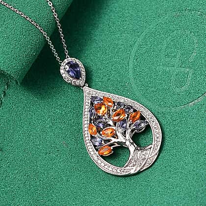 GP Tree of Life Collection - Iolite, White Zircon and Fire Opal Tree Pendant with Chain (Size 20) in Rhodium Overlay Sterling Silver 2.20 Ct.
