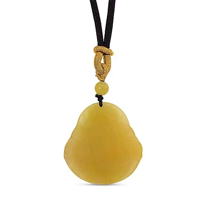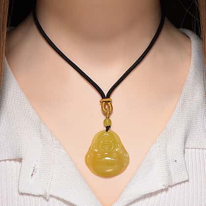 Bring good fortune and joy with this jade Buddha embossed necklace featuring a stunning laughing Buddha pendant. The laughing Buddha is believed to bring good fortune and joy. This exquisite necklace is carefully crafted with a polished honey jade gemstone and an adjustable black cord, ensuring an adjustable and comfortable fit. The vibrant honey hue makes the piece suitable for any occasion, whether it's casual or spiritual. This will bring peace and positivity to the wearer.
