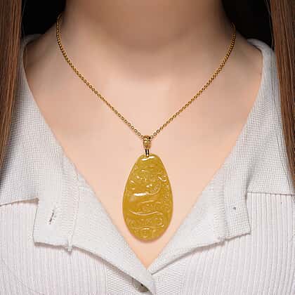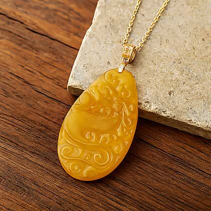 Honey Jade Dragon Embossed Pendant with Chain (Size 20) in Yellow Gold Plated Sterling Silver 80.00 Ct.