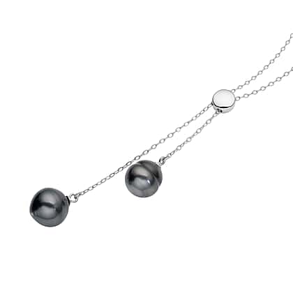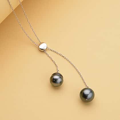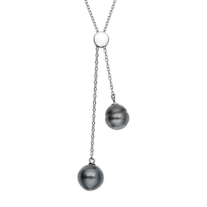 This exquisite Tahitian Pearl Necklace makes a statement in elegance. With pearls brought to you from the Tahitian Islands, the size 24 necklace features an adjustable design in the lariat style. The two black pearls have a metallic shine and dangle via chain links from the necklace made in 1.900 grams sterling silver. A platinum overlay adds a stunning appeal to the necklace.