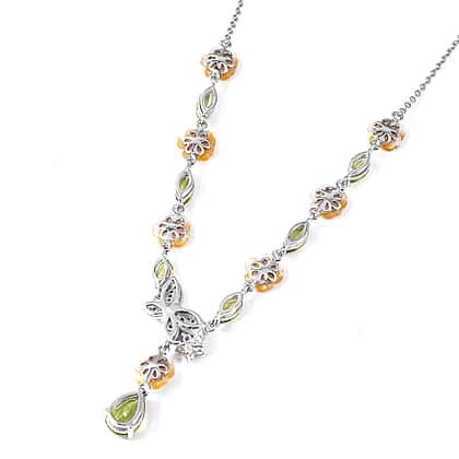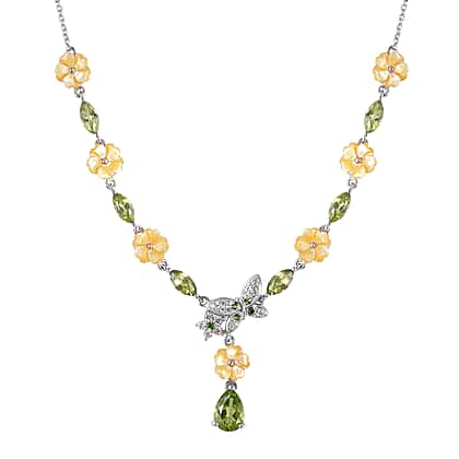 Jardin Collection - Yellow Mother of Pearl, Hebei Peridot, Chrome Diopside and Natural Zircon Necklace (Size 18) in Rhodium Overlay Sterling Silver, Silver Wt 7.80 Gms.