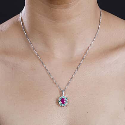 John Saul Ruby, Emerald and Moissanite Halo Pendant with Chain (Size 20) in Rhodium Overlay Sterling Silver 2.53 ct.