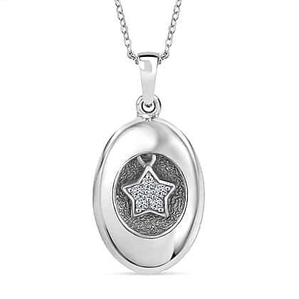 Experience celestial beauty with this lab grown pendant, featuring star inside design in light and dark tone in an oval shape frame. The delicate star design accented with lab grown diamonds adds extraordinary shine and sparkle to the piece. Crafted in 925 sterling silver with rhodium overlay, this pendant ensures lasting shine and durability with polished finish. The hypoallergenic properties in metal make it safe and secure for sensitive skin. The design is believed to have a symbolic association with hope and guidance, making it a perfect meaningful gift. This piece is ideal for special gifting and personal styling for extra brilliance and shine.