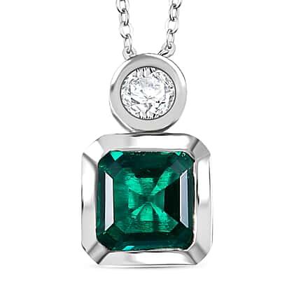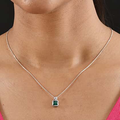 Lab Grown Emerald & Moissanite Pendant with Chain (Size 20) in Rhodium Overlay Sterling Silver 1.28 Ct.