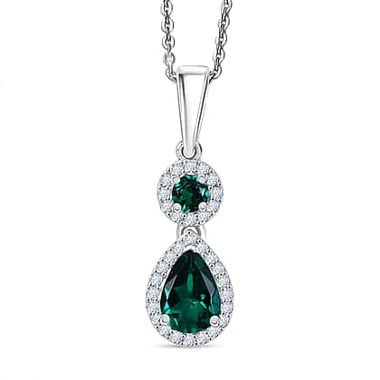 D'joy Lab Grown Emerald, White Zircon Drop Pendant with Chain (Size 20) in Rhodium Overlay Sterling Silver 1.27 Ct.