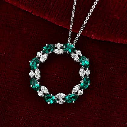 Inspired by the wreath, this stunning lab grown emerald pendant with chain (Size 20) is a symbol of balance and harmony. Featuring vibrant lab-grown emeralds arranged in a perfect circle, the design reflects eternity and wholeness. Each oval emerald is paired with sparkling white zircons, creating a striking contrast of green and brilliance. Crafted in hypoallergenic, tarnish-resistant rhodium overlay sterling silver, this pendant is both durable and skin-friendly. The 20-inch chain ensures versatile wear, whether for daily elegance or evening sophistication. A piece that speaks of renewal, refinement, and timeless charm, making it a truly treasured jewel.