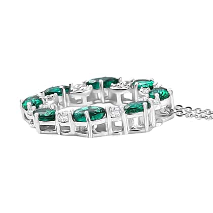 D'joy Lab Grown Emerald, White Zircon Round Pendant with Chain (Size 20) in Rhodium Overlay Sterling Silver 2.08 Ct.