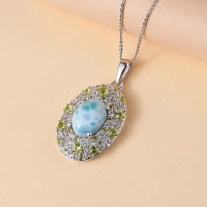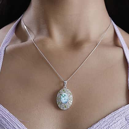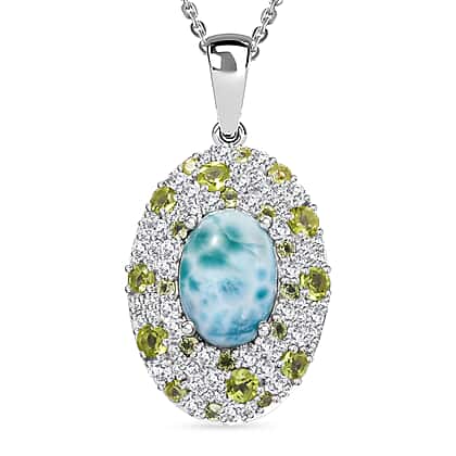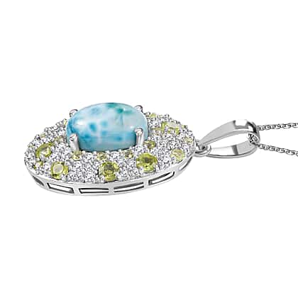 Larimar, Natural Peridot & White Zircon Pendant with Chain (Size - 20) in Rhodium Overlay Sterling Silver 11.25 Ct, Silver Wt. 7.95 Gms.